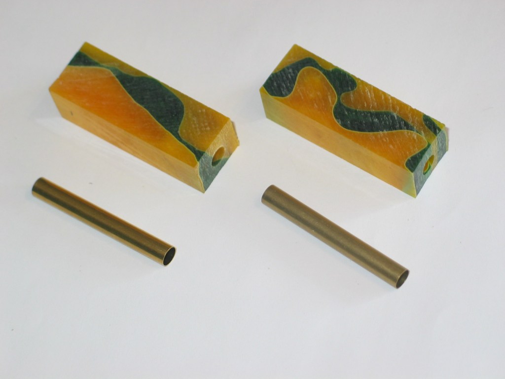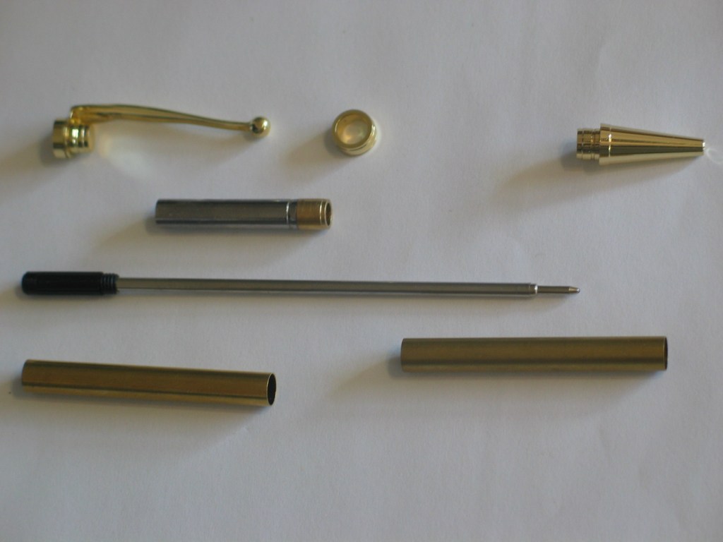 All the pens begin with the materials from the wood to acrylic as a blank. A blank is a 5 inch long by 1/2 inch wide rectangle, that I cut to the right length which is usually 2 inch long blocks that I drill a hole through and glue a brass tube in. The brass tube is a part of the pen kit, there are many different pen kits, the one I use most is a slimline kit since it is the cheapest and one of the easiest kits to make. Here are some photos of some pen blanks and pen kits.
