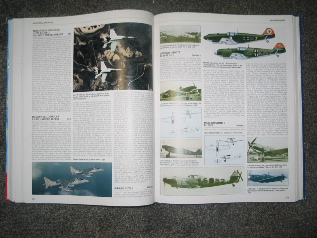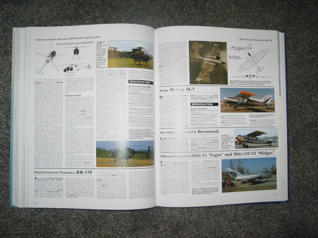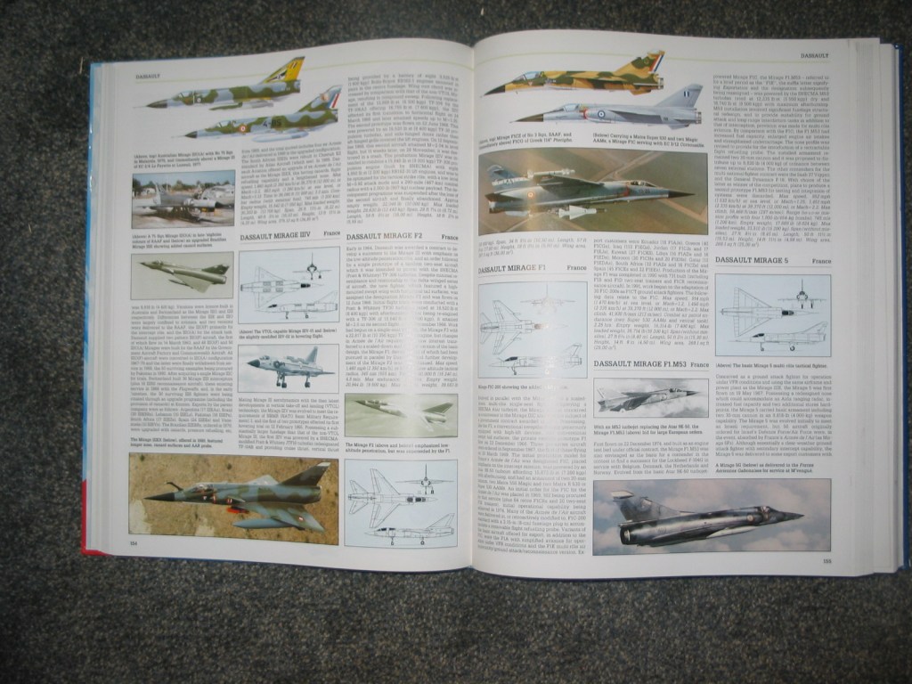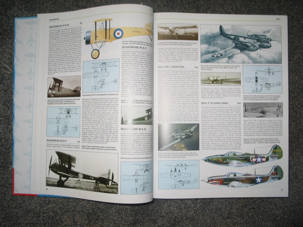 This is definitely an encyclopedia and complete book on fighter aircraft. This is a more general book with a couple photos for most aircraft and a small 3 way view square for each one, but it has an entry on almost every fighter ever conceived. It has a few entries on the Vought F-7U Cutlass that I made use of, it displays photos of many world war 1 fighters even less well known ones. It is an excellent compendium of fighters and covers many different ones to varying degrees with more popular aircraft given 1-2 whole pages, and sometimes full color 3-way views.